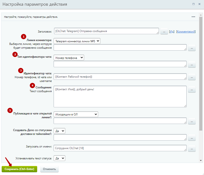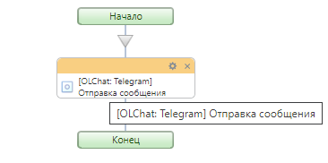 Для отправки сообщения из бизнес-процесса добавьте действие «\[Олчат: Telegram] Отправка сообщения».