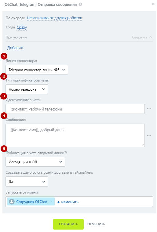 5. В поле **Публикация в чате открытой линии?** укажите каким образом отправленное роботом сообщение отобразится в чате Открытой линии. Доступны варианты: **аходящим сообщением в ОЛ, без публикации в ОЛ** и **исходящим в ОЛ.**