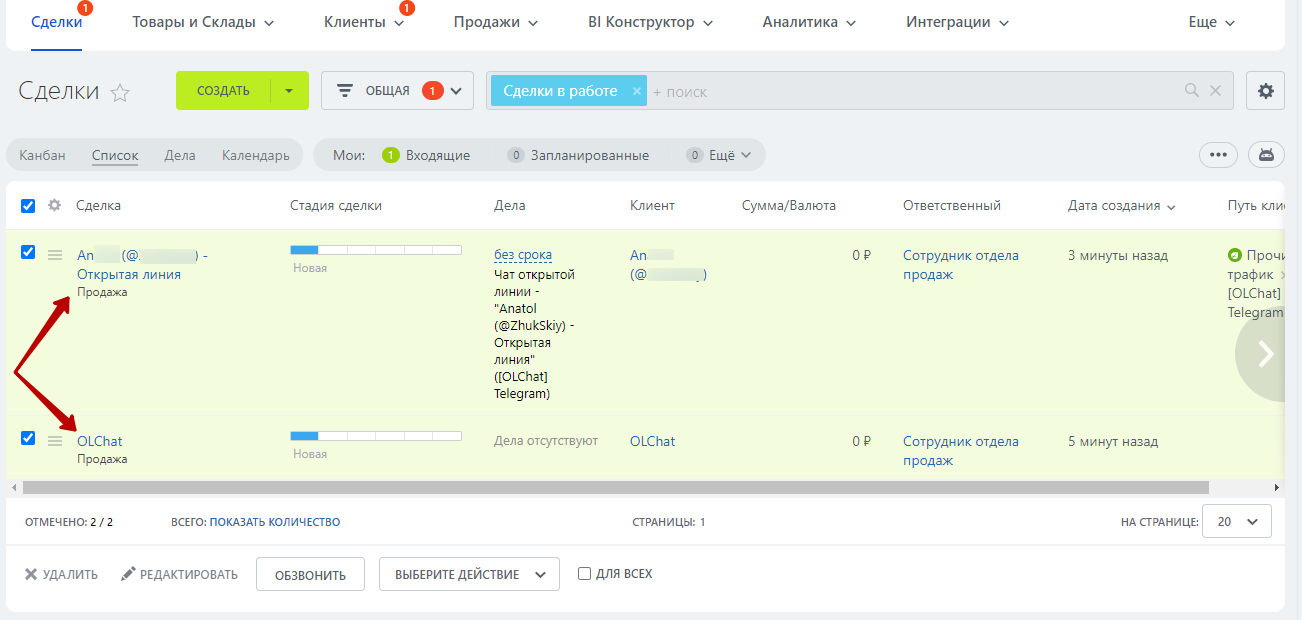 В этом случае, когда вы пишите клиенту из карточки сущности по номеру телефона, создаётся новый лид или сделка с никнеймом клиента: